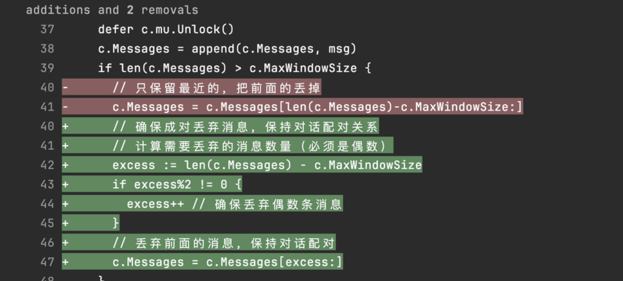 原来我的 SetMessages 函数每次添加消息超过 MaxWindowSize 时,会直接删掉最老的一条。但我在接口里是连续调用两次 SetMessages,先加用户消息,再加 AI 回复。