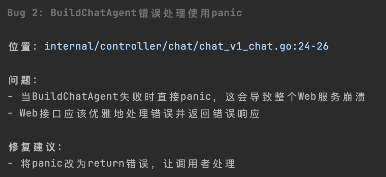 它直接警告我,Web 服务里随便 panic 会导致整个进程崩溃,建议改成 return 错误让调用者去处理。