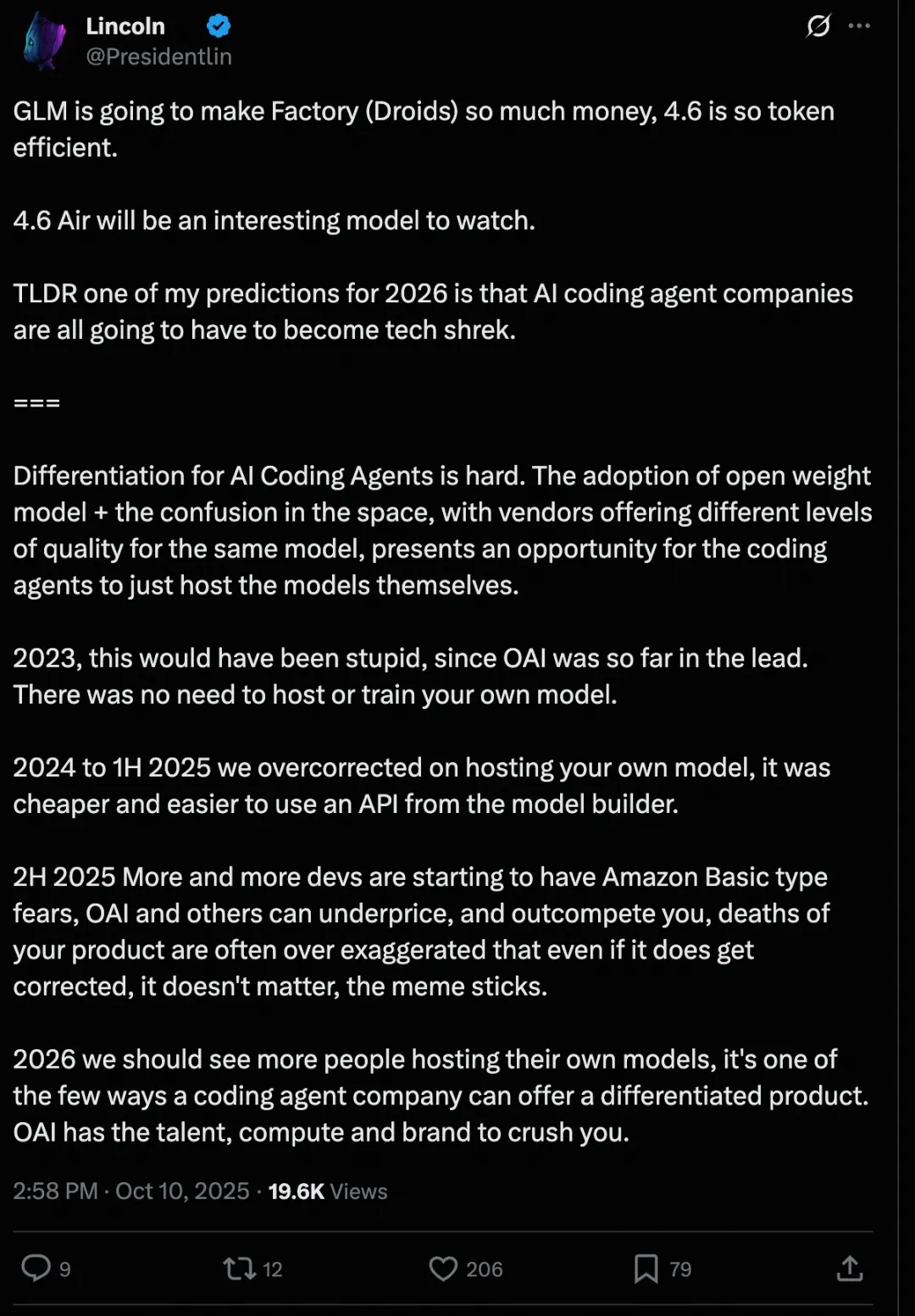 还有 Lincoln,这哥们说话更直接。他看了 GLM-4.6 的表现后感叹说,这模型太「Token Efficient」(节省 Token)了,简直是帮那些做 AI Coding Agent 的公司(比如 Factory)在印钞票。你看,在老外眼里,这不仅是好用,更是实打实的商业竞争力。