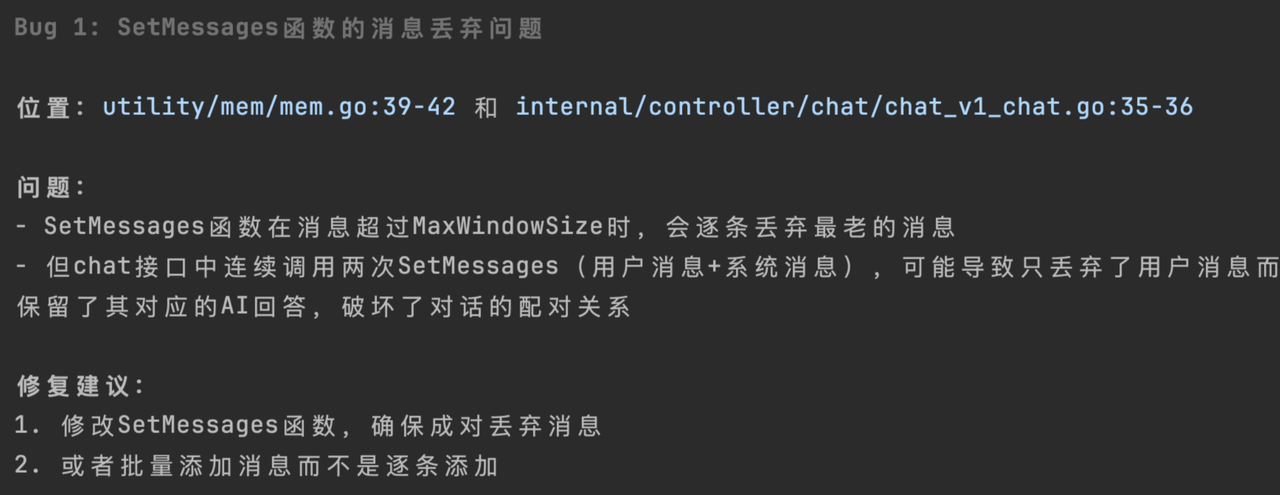 GLM-4.6 不仅精准定位到了 mem.go 和 chat_v1_chat.go 的具体行数,还一针见血地指出,在某些场景下,这会导致用户消息被删了,但对应的 AI 回复还留着,直接破坏了对话上下文的配对关系。