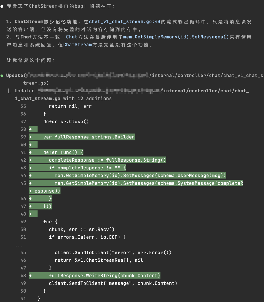 它能跳转到相关函数读代码,能结合业务场景分析逻辑漏洞,还能给出符合工程规范的修复方案,甚至考虑到流式输出这种特殊场景。
