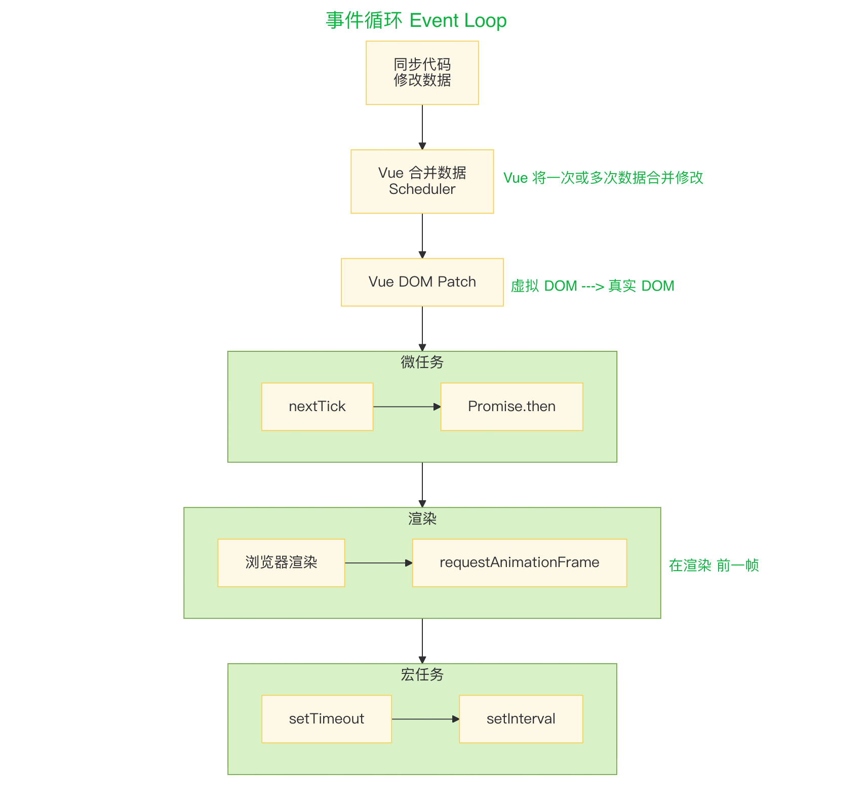 | setTimeout(fn, 0) | 下一轮宏任务 | 宏任务 | 浏览器可能会进行一次完整渲染 | 等浏览器真正渲染后执行(晚于 nextTick) |