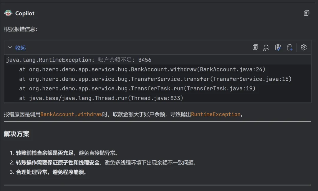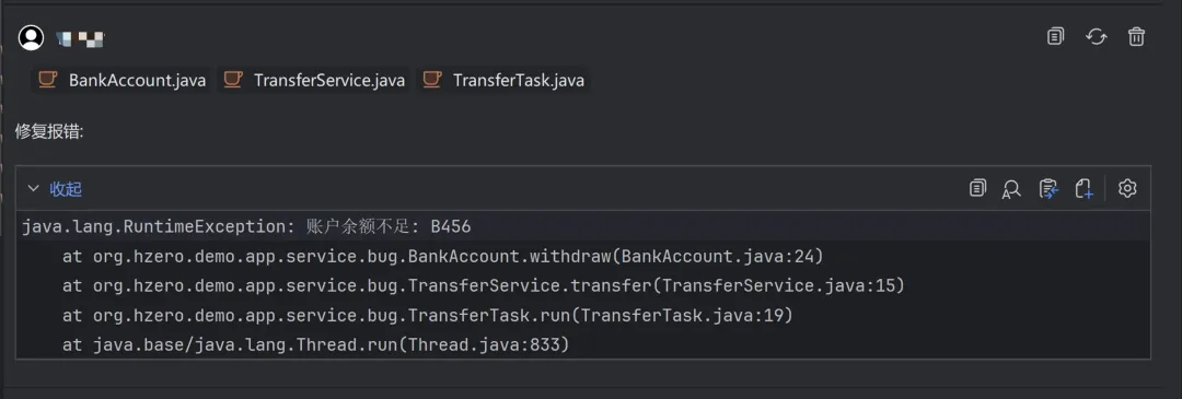 自动解析异常堆栈,并自动组装关联上下文到对话窗口中:
