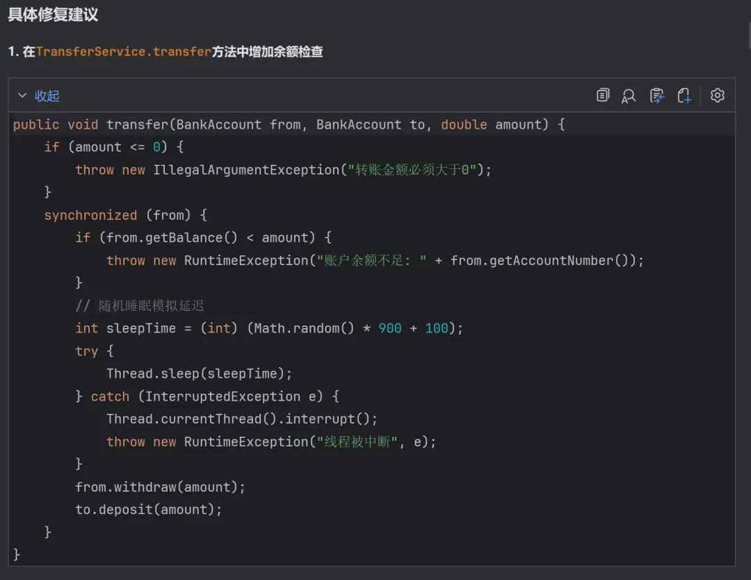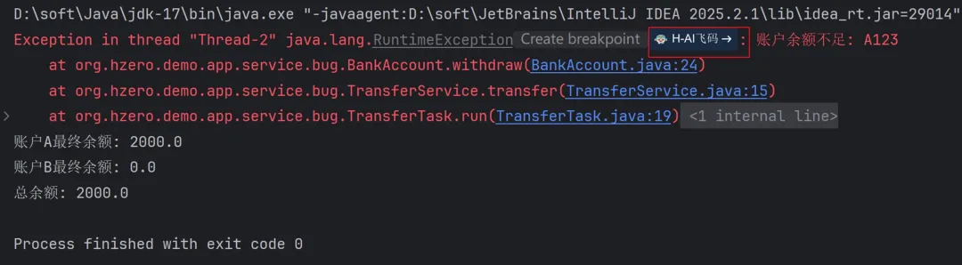 在IDEA控制台的异常堆栈中,点击飞码图标即可一键触发智能问答,帮助开发者快速定位并解决代码异常,大幅提升调试效率: