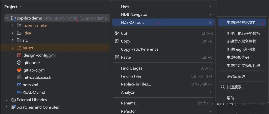 在项目根目录右键菜单中,选择“生成服务技术文档”即可。可按需选择服务对应的数据库(生成ER图和数据库设计时必需),系统将自动匹配实体类与数据库表的关联关系: