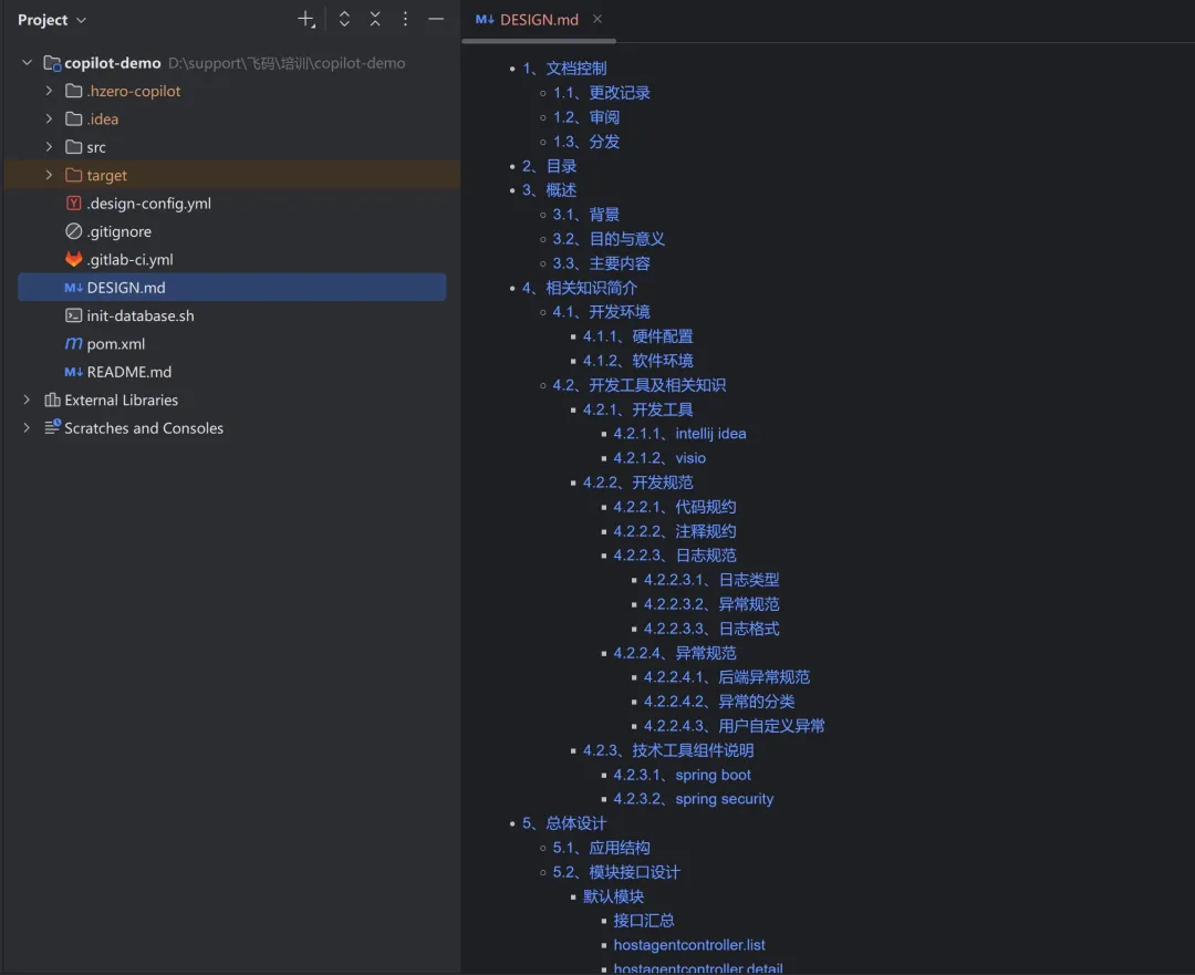 点击确认后,系统将在项目根目录下自动生成完整的技术文档,涵盖接口、数据库设计、依赖关系等关键信息,支持增量同步,方便后续查阅与维护: