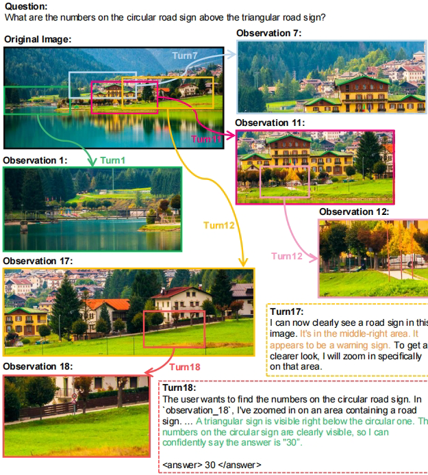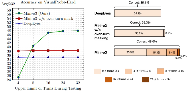 o3的核心特点是能够产生数十步的思维链条,支持多种推理模式(如深度优先搜索、试错探索和自我反思),并且推理轮次越多,准确率越高。特别是在挑战性的VisualProbe-Hard数据集上,Mini-o3达到了48.0%的准确率,显著超过其他开源模型(DeepEyes为35.1%,Pixel Reasoner为28.8%)。这项工作的意义不仅在于复现了OpenAI o3类模型的能力,更重要的是为多模态