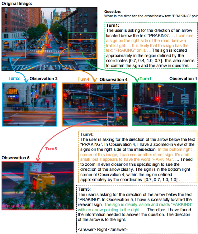 模型通过多轮推理(渐进缩放、假设修正和回溯)识别箭头方向。