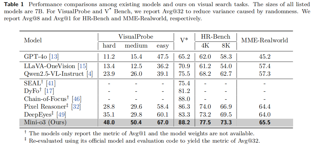 如表1(位于第9页)所示,Mini-o3在多个视觉搜索基准测试中实现了最先进的性能: