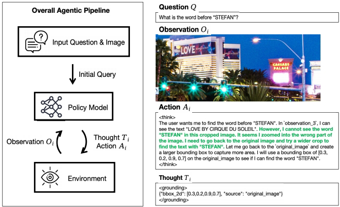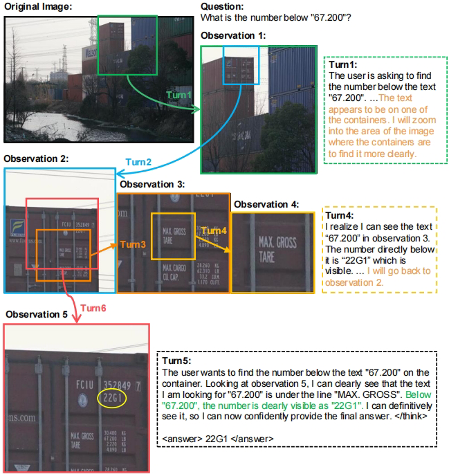 Mini-o3基于Qwen2.5-VL-7B-Instruct模型构建,其多轮代理推理流程如图所示: