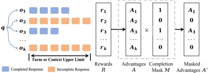 团队提出了过度轮次掩码技术(图7位于第8页),避免惩罚那些超过训练时轮次上限的响应,从而: