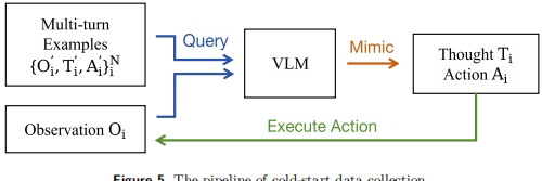 该方法使用少量人工编写的示例(仅6个),通过现有VLM模型的上下文学习能力,生成约6000条高质量多轮轨迹。这些轨迹展示了多种推理模式:深度优先搜索、试错探索和目标维持。