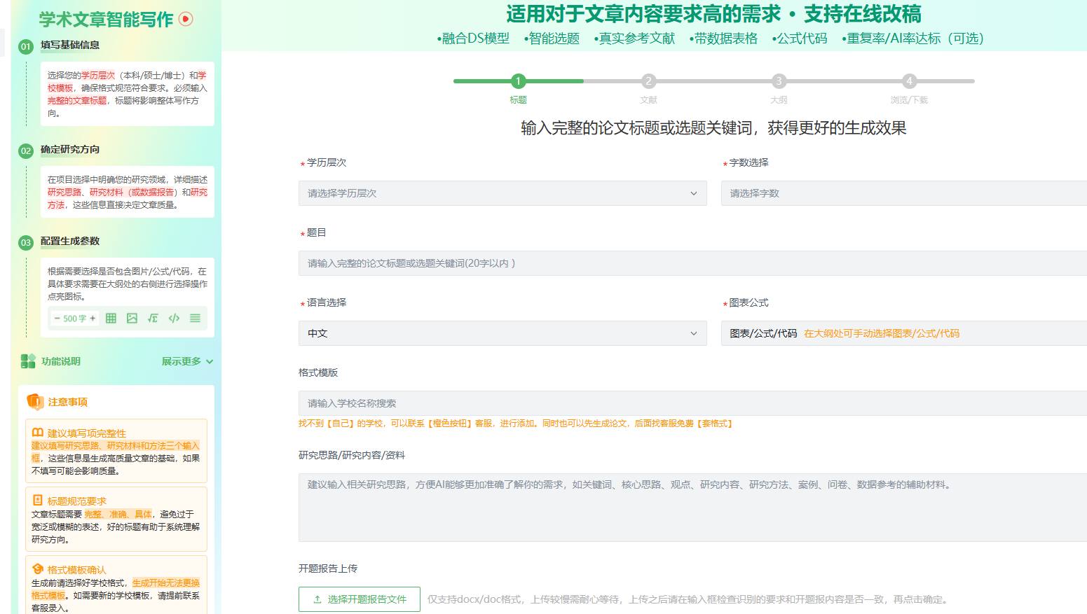 | 内容定制 | 支持**公式($\Sigma$)、图表($\psi$)、代码($\Sigma$)**图标点亮,精确控制章节内容倾向。 | 确保技术内容专业、有价值,非无意义元素堆砌。 |