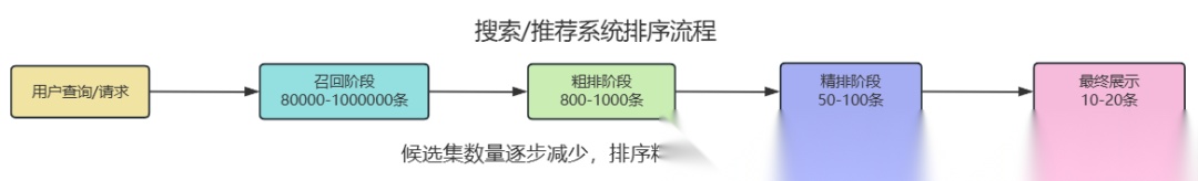 比如:抖音短视频推荐通过召回数万个可能相关视频,再通过粗排缩减至数百条,最后精排阶段根据用户最近的互动,视频热度、内容多样性等复杂因素,确定最终展示的10个视频和顺序。