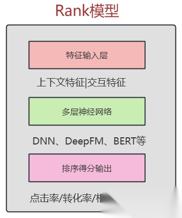 Rank模型(排序模型)负责对召回阶段筛选出的候选集进行精确排序,考虑多种特征评估相关性。