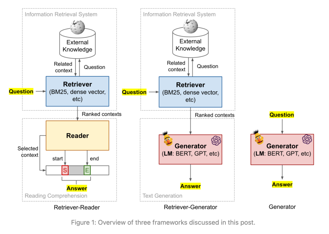 翁荔在《How to Build an Open-Domain Question Answering System?》中将开放域的问答系统分为了 3 类。如下图所示