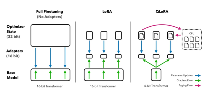 QLoRA是LoRA的量化优化版本,通过将预训练模型权重量化至4位(如NF4数据类型)存储,进一步减少显存占用。例如,13B参数模型的QLoRA微调可在单张24GB显存的显卡上完成,而全参数微调需多张80GB显卡集群。该技术已成为中小算力场景下的首选方案。