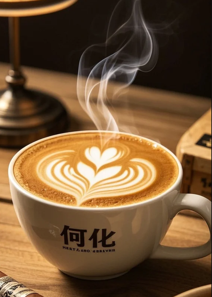 生成结果加载完成的瞬间,我直接愣住了 —— 画面完全命中了所有需求:奶白色背景上,浅咖色的手绘咖啡杯冒着热气,杯身拉花细腻精致,“焦糖玛奇朵” 用纤细的英文与中文搭配,放在视觉中心,周围留白恰到好处,既有 ins 风的简约感,又透着咖啡的温暖氛围。