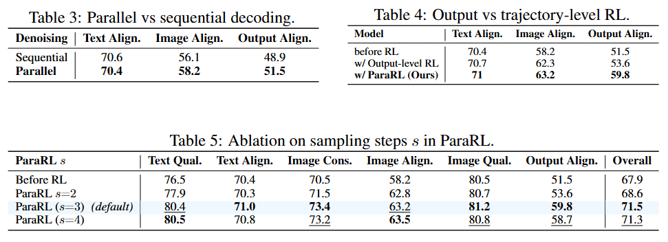 轨迹级微调是否优于输出级微调? 实验(表 4)显示,与仅在最终输出计算奖励的传统 RL 相比,本文提出的 ParaRL(轨迹级优化)在文图一致性和输出对齐方面带来了更显著的增益,并且训练动态更稳定。进一步分析(表 5)发现,在轨迹中采样 3 个步骤()进行奖励计算,是在性能和效率之间的最佳平衡点。