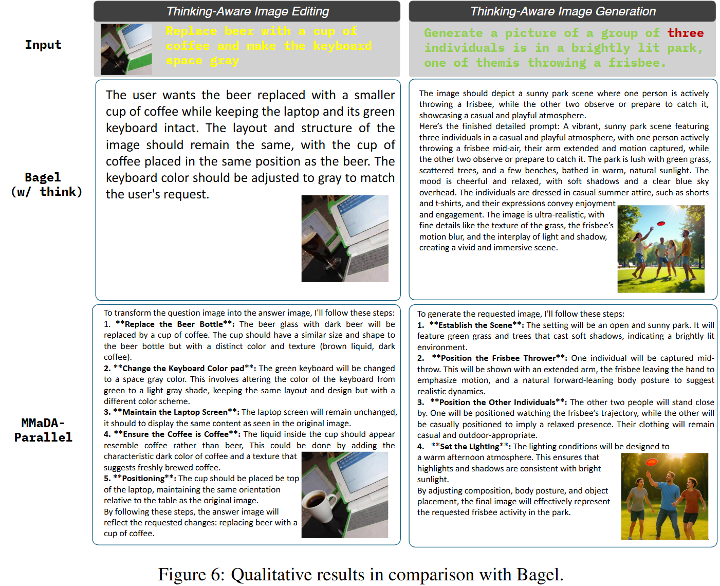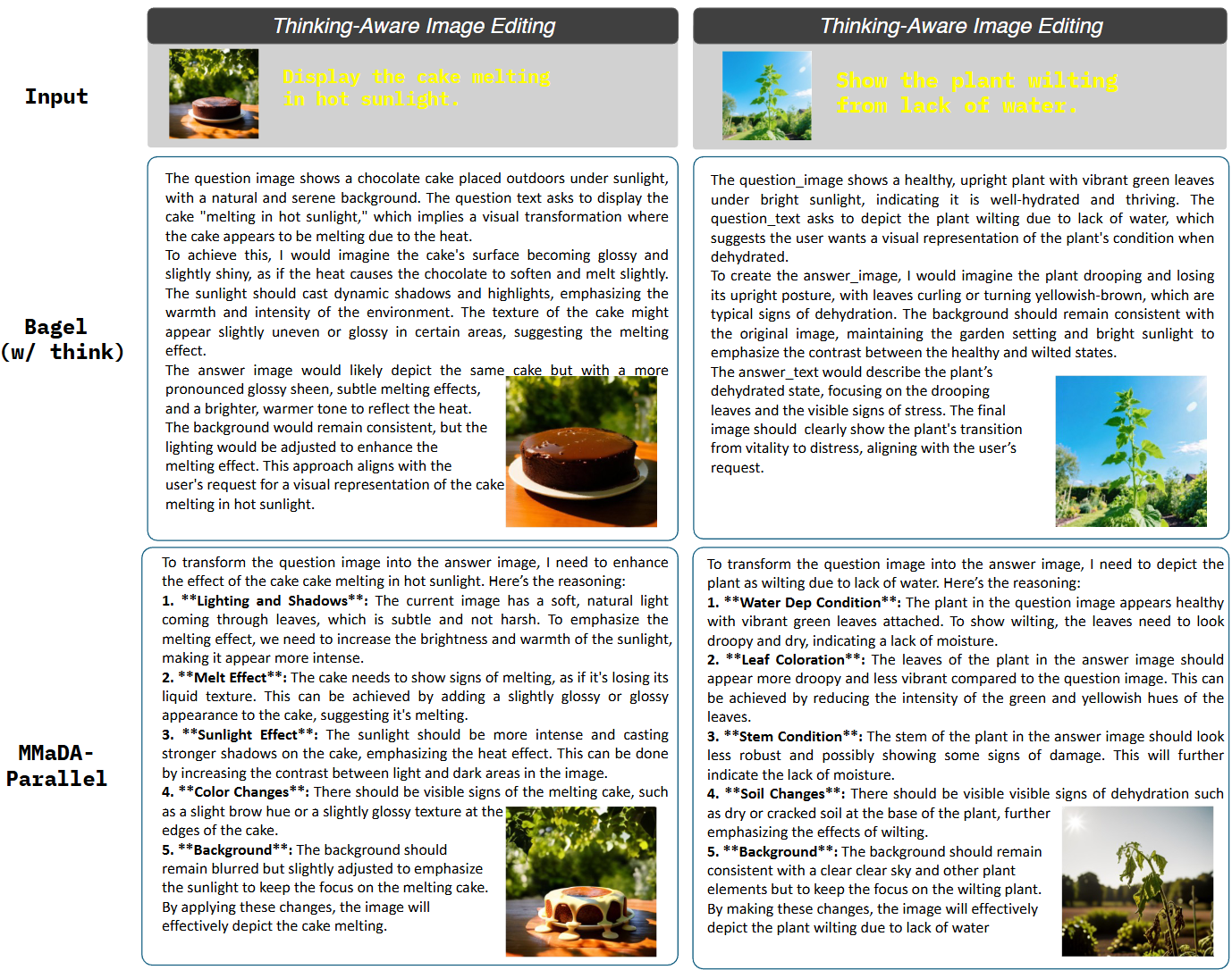 图 2:MMaDA-Parallel 支持并行、感知思维的图像编辑和生成。与 Bagel 相比,MMaDA-Parallel 的推理质量更高,生成的文本和图像输出之间的一致性也更强。