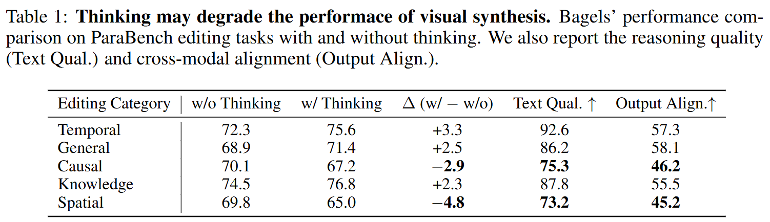 为了研究预生成推理是否真正能提升性能,本文在图像编辑任务上进行了一项对照研究,因为这类任务比单纯的图像合成提供了更清晰的、基于指令的评估。从已有的基准测试中采样输入,并使用 Bagel——一个支持“思考感知”型生成的先进开源统一模型——在开启和关闭“思考”功能两种模式下生成成对的输出。在图 1(c) 和表 1 中报告了在 Kris-Bench上的平均编辑评估指标。