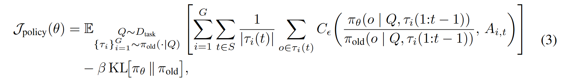 其中 。在这个目标函数中,求和是在稀疏采样的步骤 上进行的。项 遍历了在采样步骤 的状态 中的所有 token,而 表示在步骤 之前生成的所有 token 的完整历史。最后, 是用于生成部署样本的行为策略, 控制 KL 惩罚的强度。