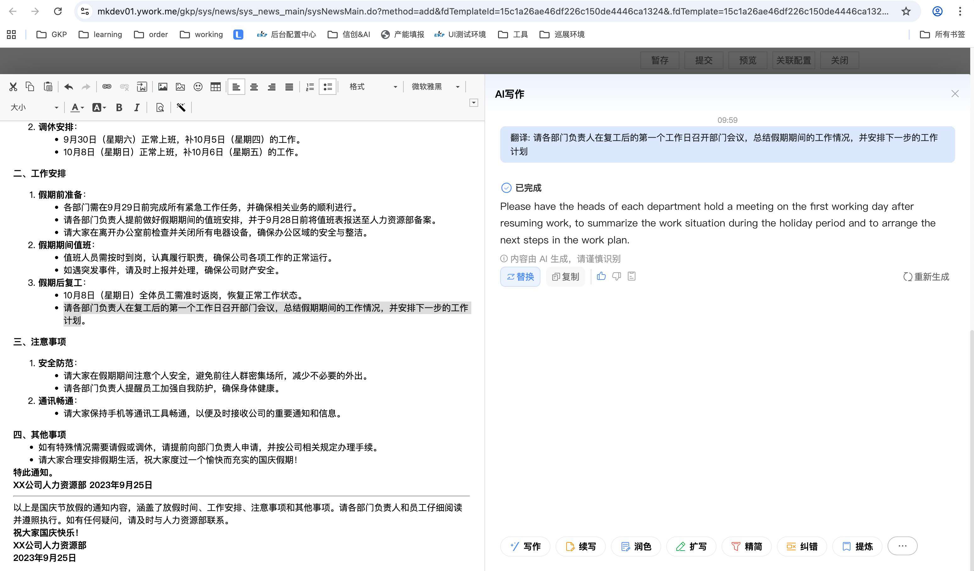 在企业制度、办公通知等场景中,AI 可辅助完成内容的逻辑校验、语言润色。如截图中的假期通知,可通过 “纠错” 功能修正表述漏洞,通过 “提炼” 功能总结核心信息,还能通过 “翻译” 生成英文版本,满足跨国企业的多语言需求。
