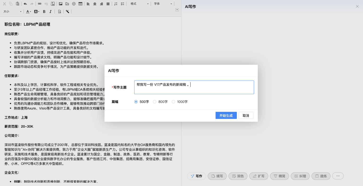- 定义创作需求:输入 “写作主题”(如 “帮我写一份 V17 产品发布的新闻稿”),并选择篇幅(500 字 / 800 字 / 1000 字);