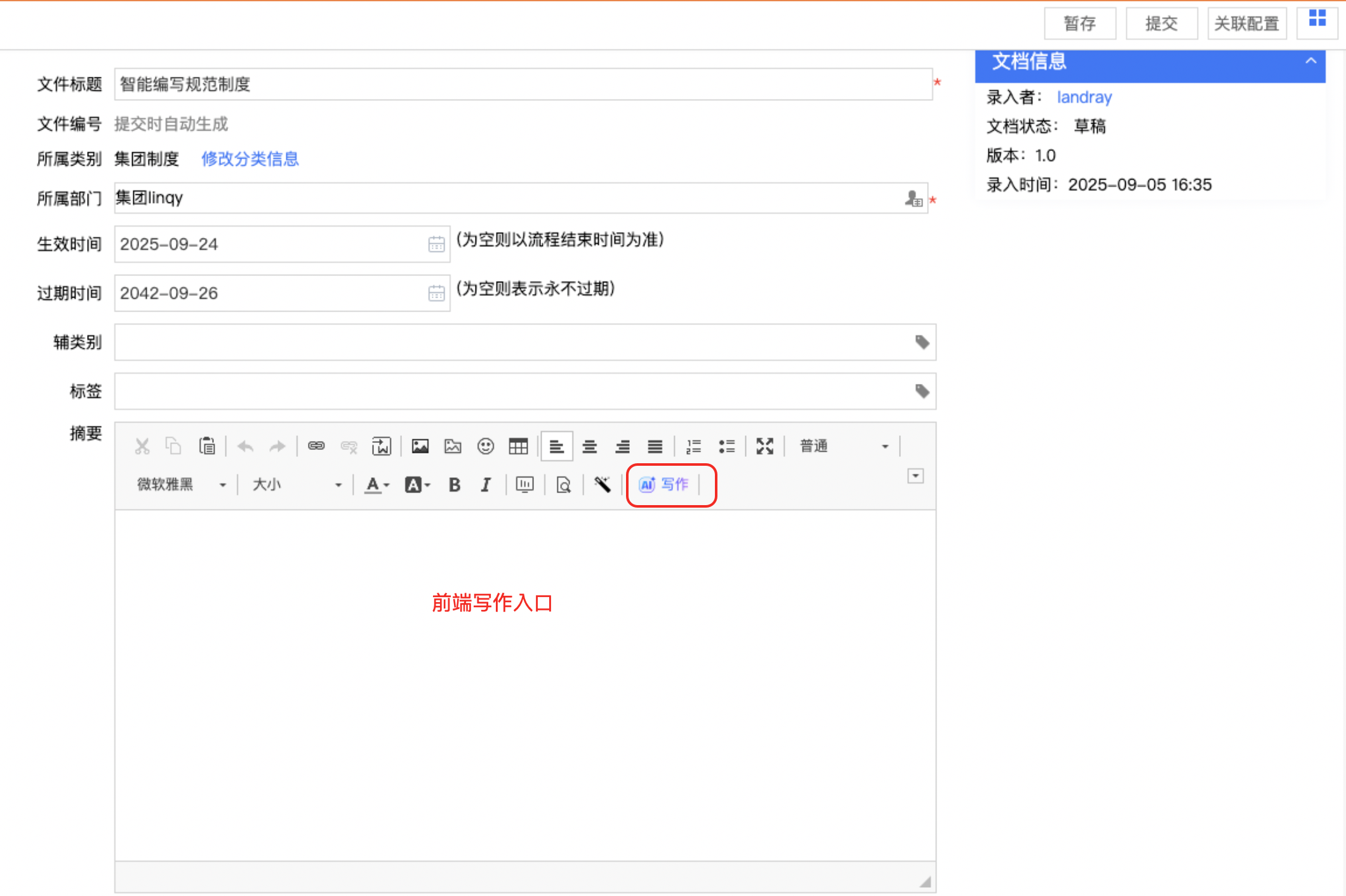 在数字化办公与内容创作深度融合的当下,AI 辅助写作技术正成为企业提升内容生产效率、保障内容质量的关键利器。本文将详细介绍我们新开发的集成于企业文档系统的 AI 智能写作功能,其依托强大的自然语言处理能力,实现了从新闻稿创作到多场景文档辅助的全流程智能化支持。