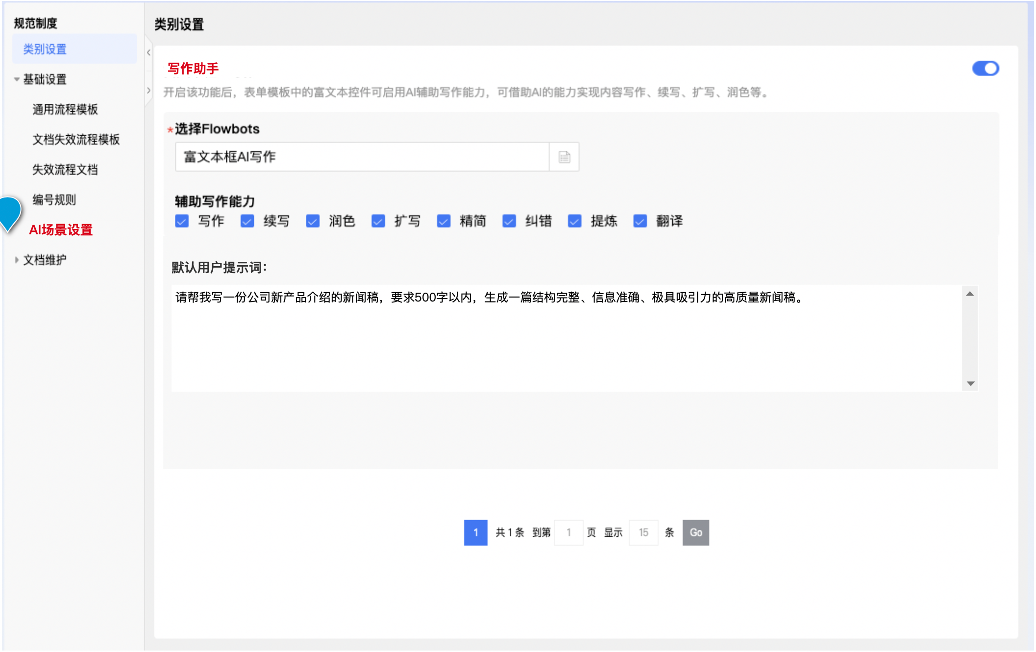 - 场景化配置能力:可在后台 “AI 场景设置” 中定义默认提示词、功能开关、Flowbots(富文本框 AI 写作机器人),实现场景化能力定制(如新闻稿、制度文档等专属创作逻辑)。
