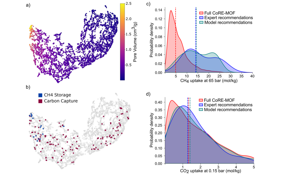 使用基于结构的嵌入(量化MOF化学和几何特征的机器学习描述符)进行专家引导的材料推荐。这种方法能够基于孔隙几何和化学特性提供精准的材料推荐。