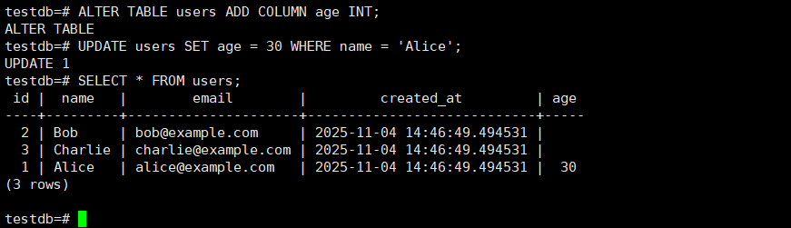 UPDATE users SET age = 30 WHERE name = 'Alice';