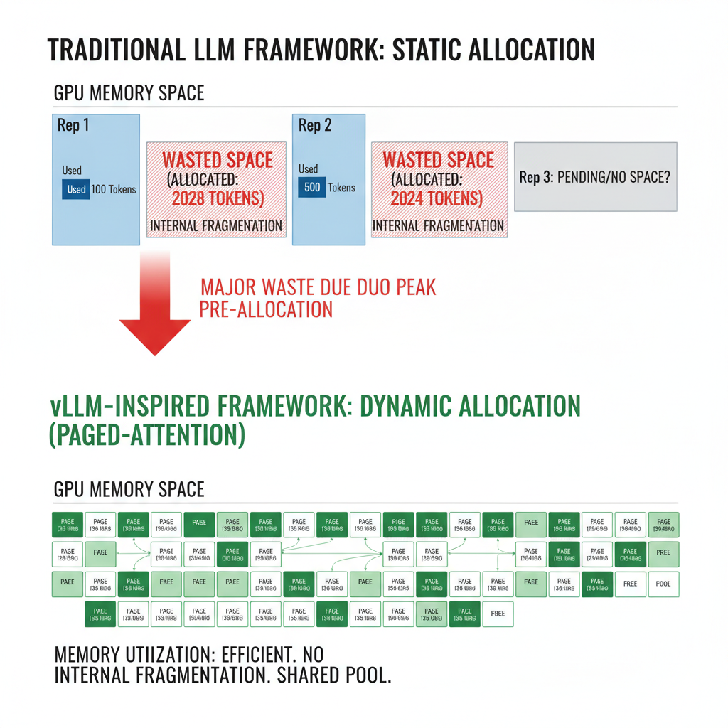 这两种浪费共同导致GPU显存利用率低下,系统能同时处理的并发请求数(即吞吐量)也大打折扣。