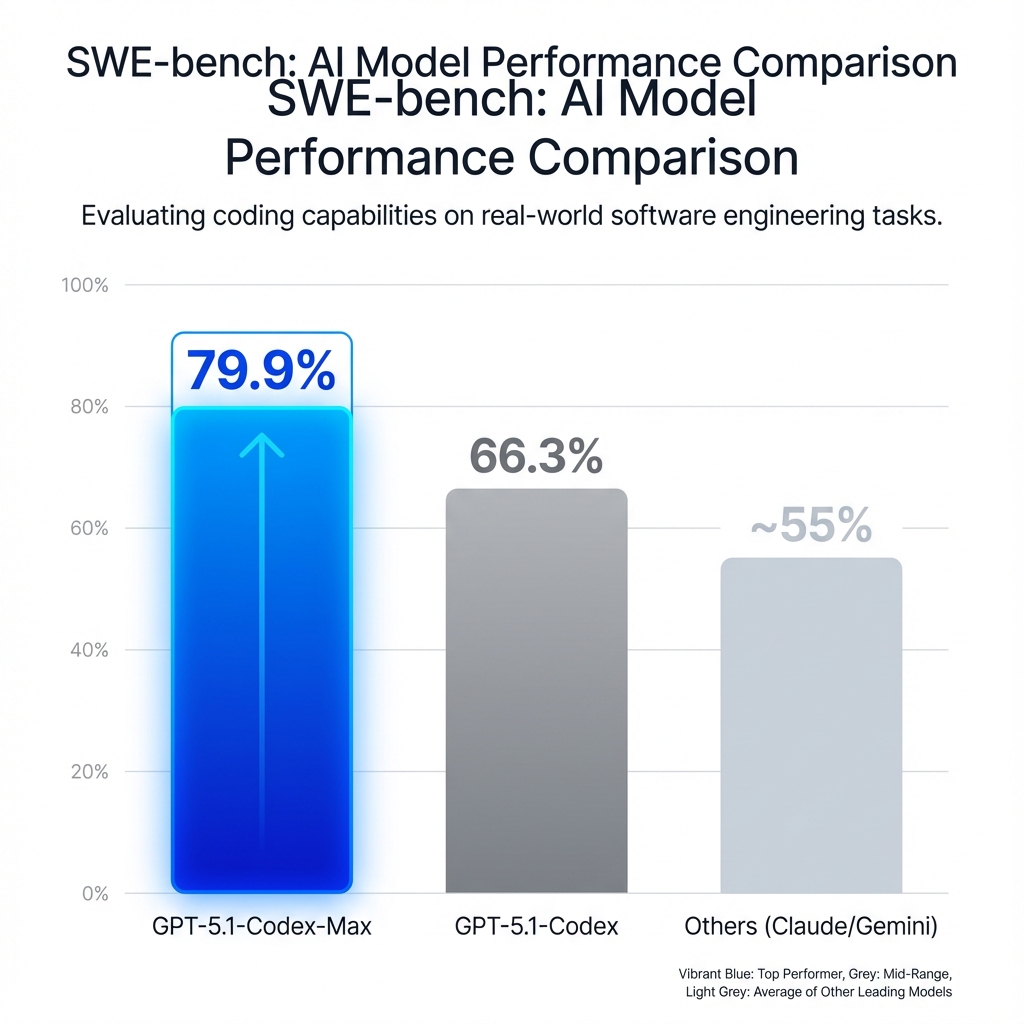 光说不练假把式。在软件工程领域最硬核的 SWE-bench 测试中,GPT-5.1-Codex-Max 交出了一份恐怖的答卷。