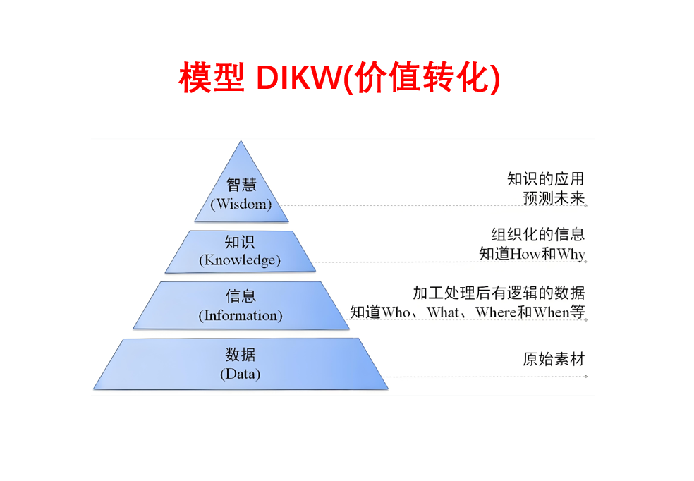 对组织:企业、政府等机构需要 “将数据转化为竞争力”(如用户数据→用户需求信息→产品优化知识→市场战略智慧),但此前各部门对 “数据该怎么用” 的理解不一致(技术部门管数据存储,业务部门要信息支持,决策层要战略依据),DIKW 模型提供了 “跨部门协同的共同逻辑”(比如技术部门知道 “数据要加工成有上下文的信息”,业务部门知道 “信息要整合为可复用的知识”,决策层知道 “知识要结合价值判断形成智慧”)。