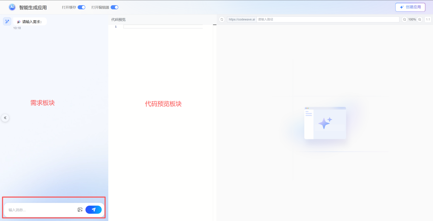 点 “智能生成应用”,进入操作界面 —— 左边是输入框,右边是预览区,中间像聊天框,上手毫无难度。目前支持 3 种输入方式,我都试了,都很好用: