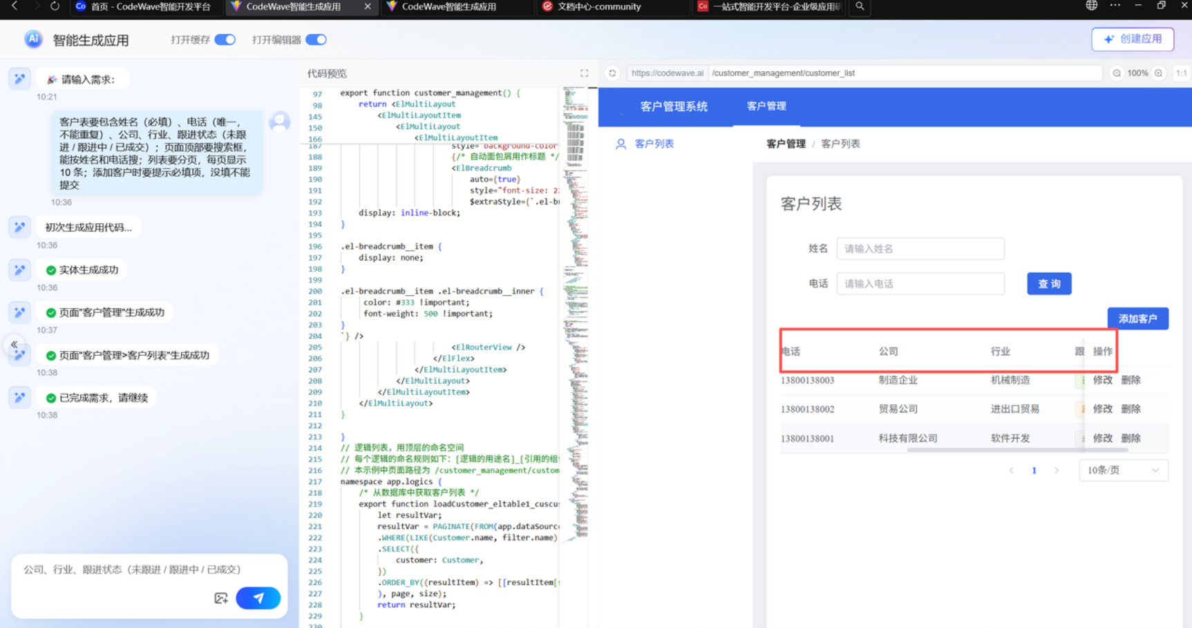 如果想更细致,就多补点信息,比如:“客户表要包含姓名(必填)、电话(唯一,不能重复)、公司、行业、跟进状态(未跟进 / 跟进中 / 已成交);页面顶部要搜索框,能按姓名和电话搜;列表要分页,每页显示 10 条;添加客户时要提示必填项,没填不能提交”。