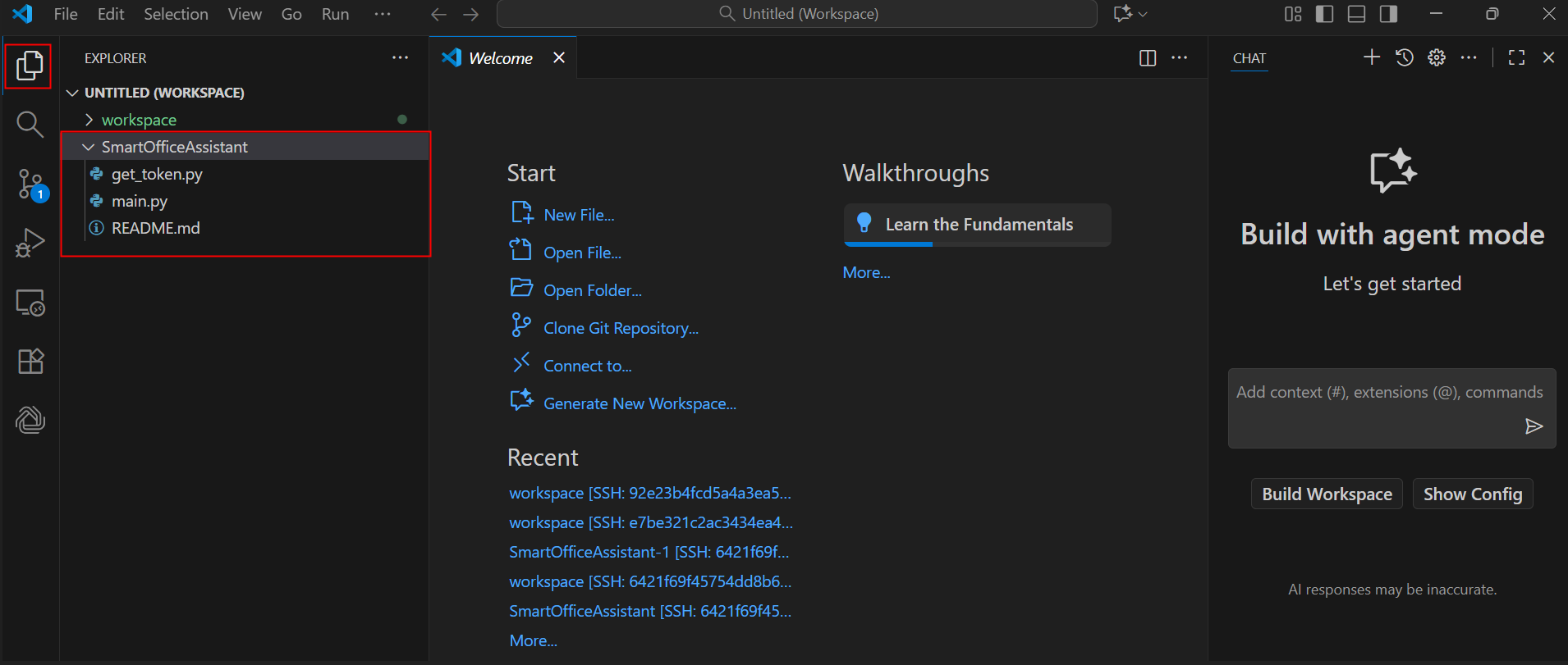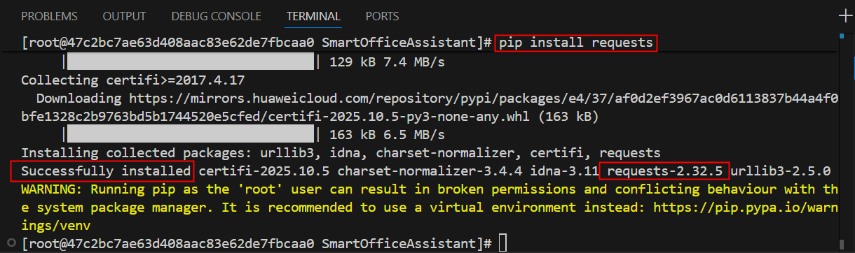 按下Ctrl+Shift+`,打开Terninal窗口,选择SmartOfficeAssistant目录,安装requests。