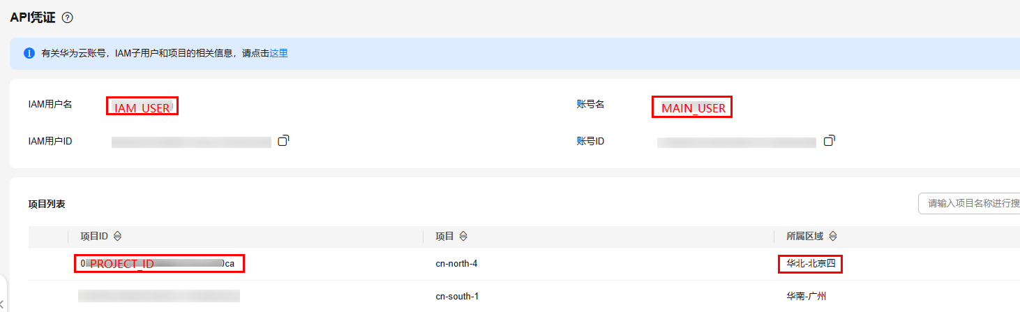 进入API凭证界面,即可获取IAM用户信息,记录IAM用户名、账号名、区域华北-北京四对应的项目ID,留作后面步骤使用。