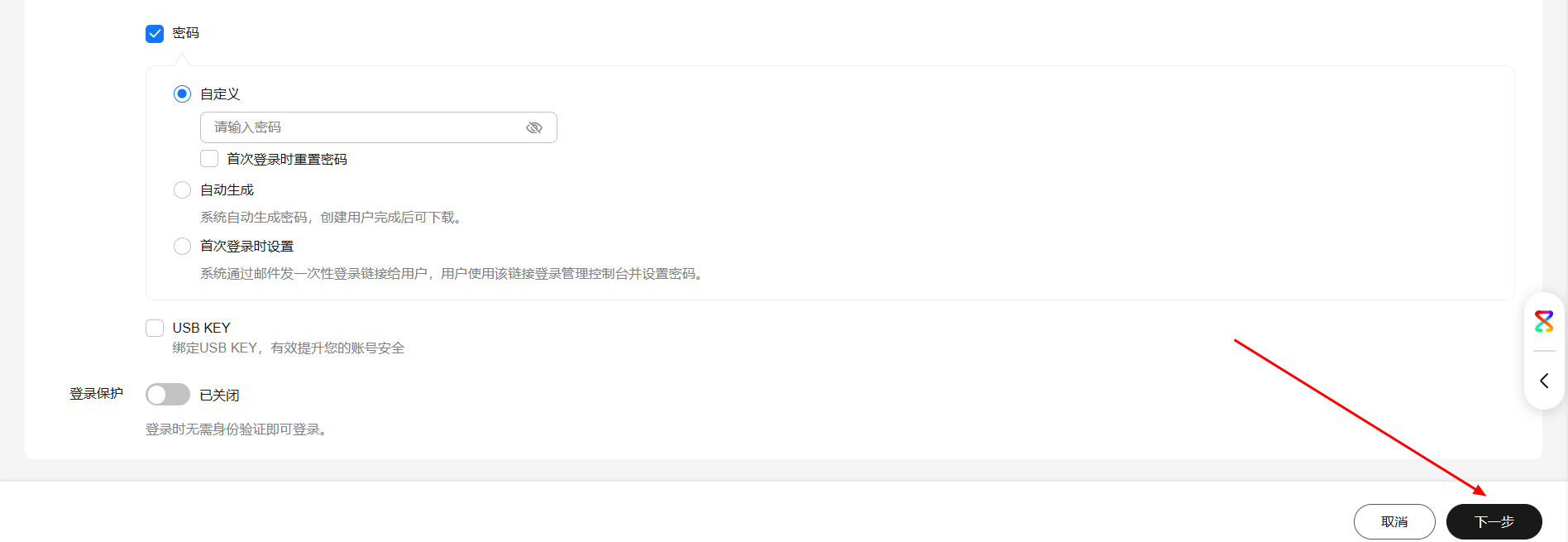 | 凭证类型 | 勾选访问秘钥、密码 ,自定义IAM账号密码 |