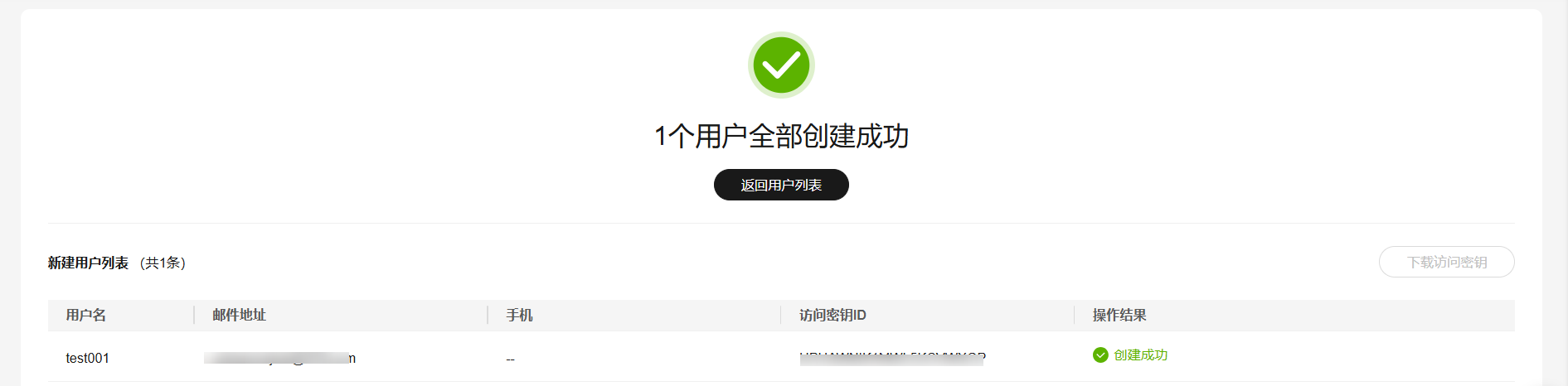 点击创建用户,输入验证码进行操作确认,取消下载访问秘钥,点击我已知晓,即可创建成功。
