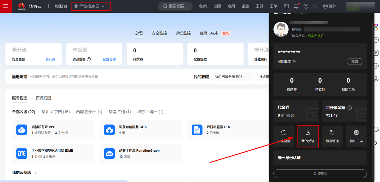 登录成功后,进入控制台,选择华北-北京四,右上角个人信息点击我的凭证