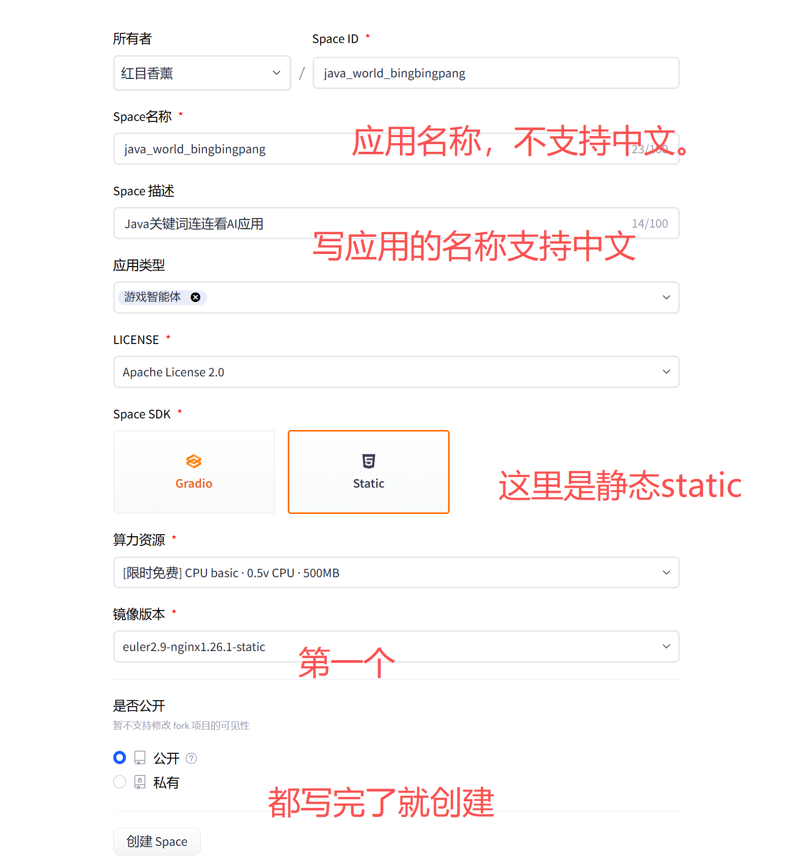 进入到spaces创建页面: