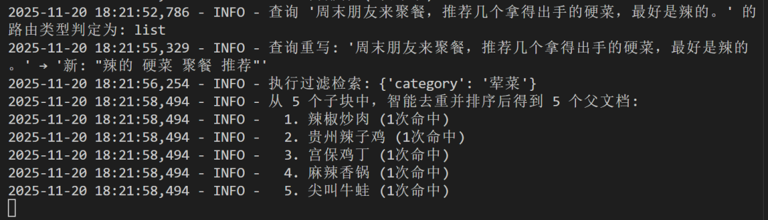 '辣的 硬菜 聚餐 推荐'。 - 元数据过滤:提取出了