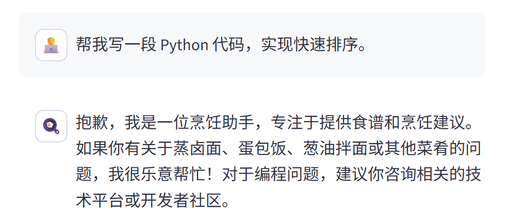- 生成回答:系统没有受到诱导去写代码,而是坚定地回复:“抱歉,我是一位烹饪助手…如果你有关于蒸卤面、蛋包饭…的问题,我很乐意帮忙!”