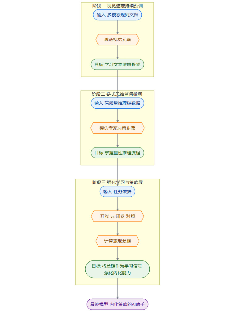 【摘要】一种将外部多模态规则转化为模型内部策略的新范式,通过三阶段学习显著提升AI在复杂业务场景下的决策效率、准确性与合规性。