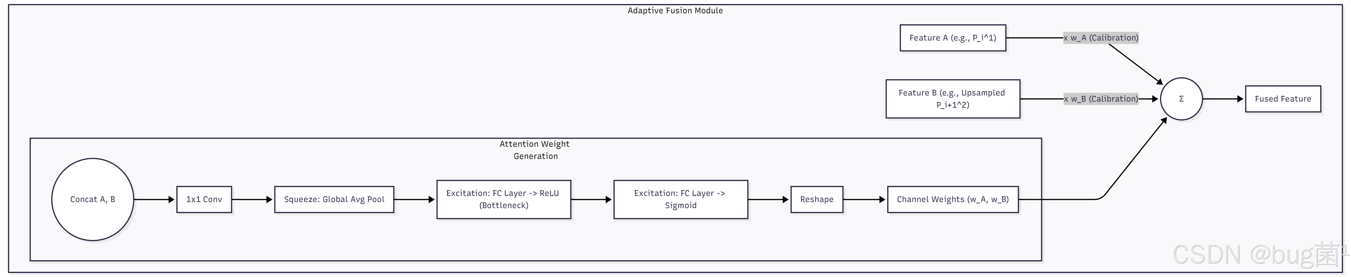 这个模块借鉴了SENet和BiFPN的思想,通过全局平均池化来捕捉全局的通道信息,然后通过两个全连接层来学习通道之间的非线性依赖,最终生成每个通道的融合权重。
