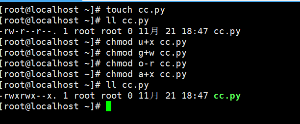 例如我们首先创建 cc.py 测试文件并查看初始权限,然后依次给文件所有者添加执行权限、给所属组添加写权限、移除其他用户的读权限,最后为所有用户添加执行权限。