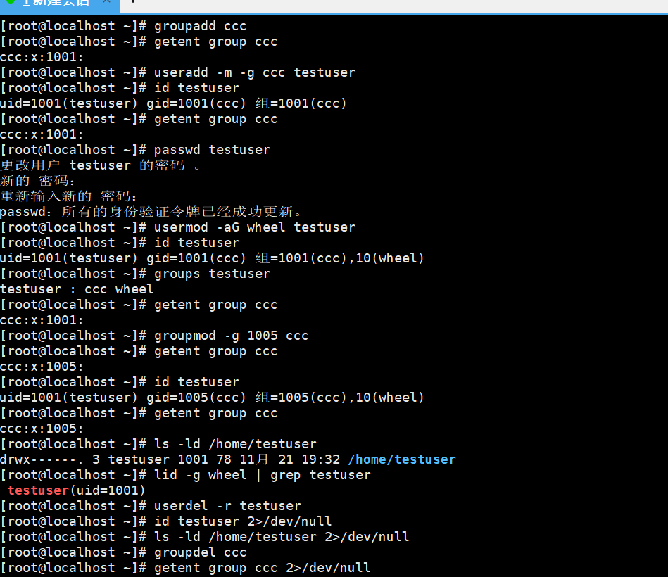 我们来一个简单的操作:首先创建名为"ccc"的用户组,然后在该组下建立testuser用户并设置登录密码,接着我们将用户加入wheel附加组以提升权限,之后再修改ccc组的标识ID,最后按创建顺序的逆序去清理资源——删除用户及其主目录,并移除用户组。
