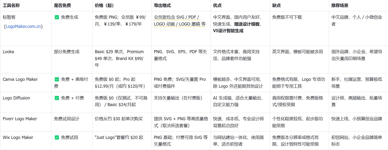 想知道哪款 Logo设计免费生成器真正适合你?下面这张对比表汇总了标智客、Looka、Canva 等热门工具的功能特点与价格信息,让你能清晰了解哪款软件在免费生成、导出格式或品牌延展方面表现最佳。